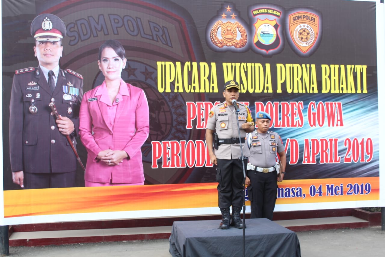 Faktual. Net. Gowa_Bertempat di lapangan apel, pada Sabtu (04/05) pukul 09.30 wita, jajaran Polres Gowa menggelar Upacara Wisuda Purna Bakti terhadap 10 personil yang memasuki masa pensiun. 4/5/19