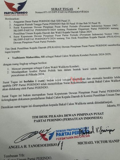 Surat Tugas yang bernomor 071-ST/DPP-PARTAI PERINDO/VI/2024 itu menyebutkan bahwa Yudhi diberikan waktu satu bulan untuk mencari koalisi partai dukungan serta pasangan calon wakil walikota.