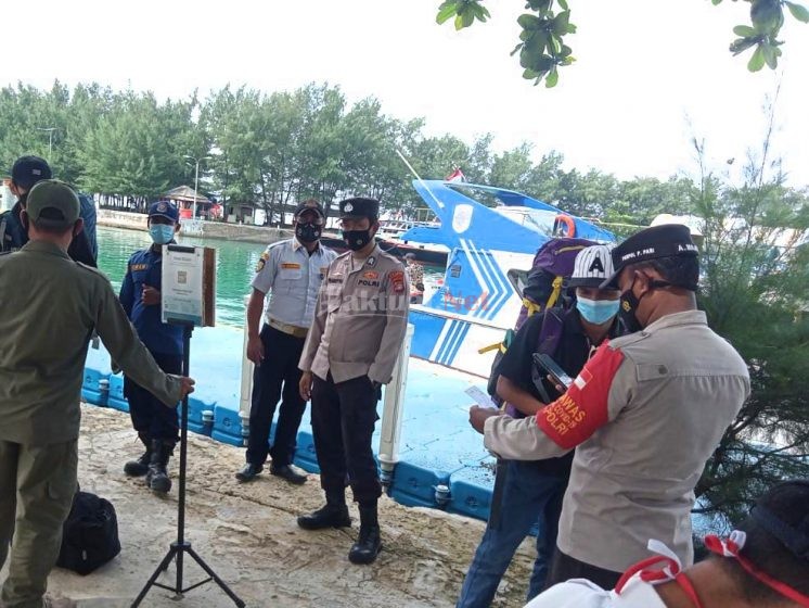 Faktual.Net, Kepulauan Seribu, DKI Jakarta– Polsek Kepulauan Seribu Selatan melakukan pengawasan protokol kesehatan ketat di Dermaga Kedatangan Pulau Pari, Kamis (27/1/2022).