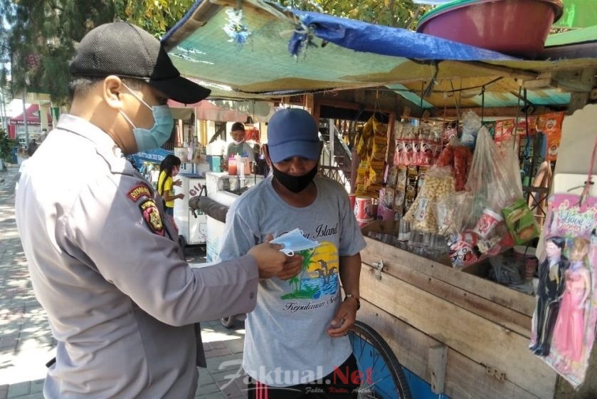 Faktual.Net, Kepulauan Seribu, DKI Jakarta – Dalam rangka mencegah penyebaran Covid-19, Polres Kepulauan Seribu bersama jajaran terus melakukan himbauan protokol kesehatan dan membagikan masker ke warga di delapan pulau pemukiman. Minggu (8/8).