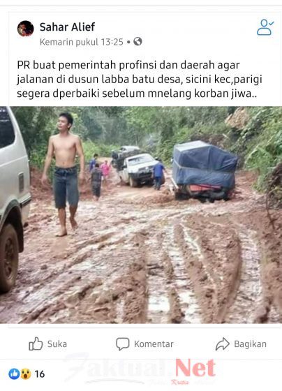Dalam unggahan di akun facebook pribadinya  pada Kamis 6/2/2020 sekira pukul 13:25 Sahar Alief sembari melampirkan keterangan dalam unggahannya “PR buat pemerintah profinsi dan daerah agar jalanan di dusun labba batu desa, sicini kec,parigi segera dperbaiki sebelum mnelang korban jiwa..”