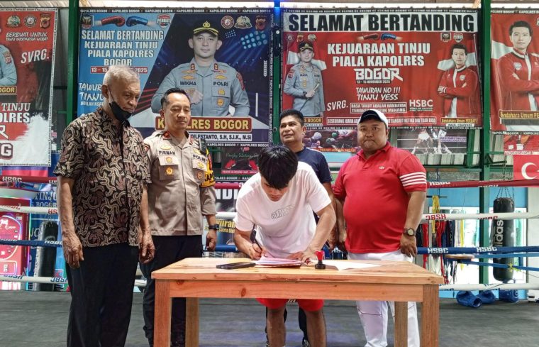 Penandatanganan kontrak berlangsung di Sasana HS Boxing Camp, Ciseeng, Parung, Kabupaten Bogor, Rabu (29/04/2026), dihadiri pemilik sasana Hengky Silatang, promotor Nikolas Johan Kilikily (Niko), Co-Promotor Yance Rahayaan, serta Kapolsek Parung Kompol Firman.