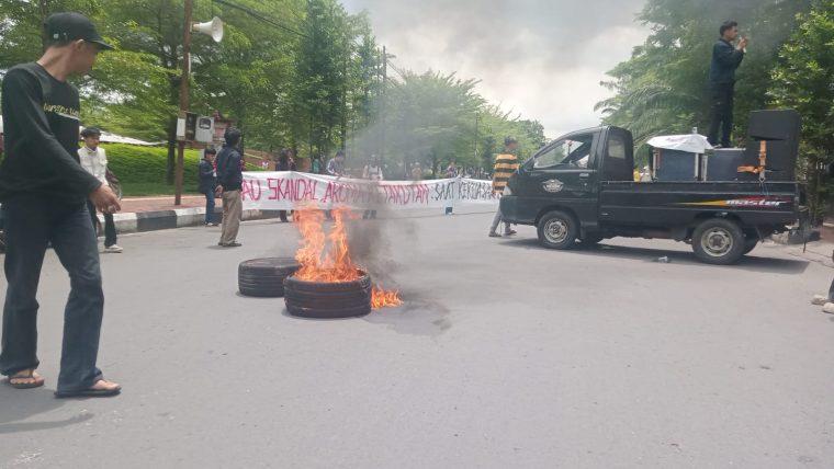 Selain orasi, massa membentangkan spanduk panjang yang memblokade jalan sebagai simbol bahwa kepercayaan publik sedang “terhambat” oleh kaburnya transparansi. Asap hitam dari pembakaran ban membubung tinggi, menandakan panasnya tensi sosial di tengah masyarakat Gowa saat ini.