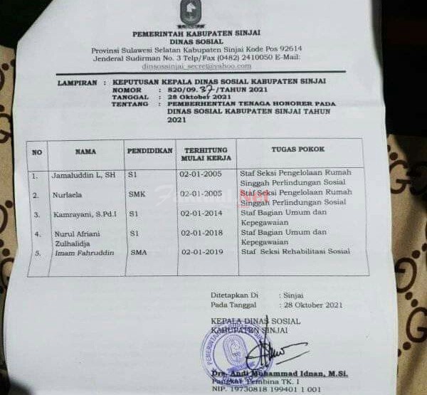 Faktual.Net, Sinjai, Sulsel –  Viral dimedia sosial (Medsos) Facebook, Surat pemberhentian (Pecat) tenaga honorer Dinas Sosial (Dinsos) Kabupaten Sinjai.