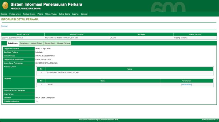Hal itu berdasarkan Sistem Informasi Penelusuran Perkara (SIPP) Pengadilan Negeri Kendari mencatat jadwal sidang perkara tindak pidana. Perkara dengan nomor 300/Pid.Sus/2025/PN KDI tersebut terjadwal akan disidangkan pada tanggal 03/09/2025 (Besok).