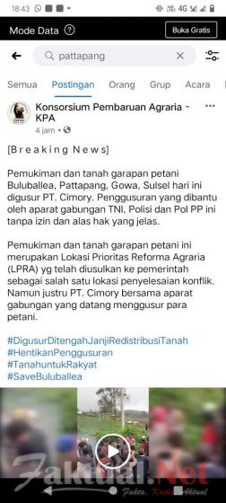 Faktual.Net, Gowa, Sulsel– Terkait adanya postingan di media sosial Facebook pada Rabu (7/04/21), dengan nama akun “Konsorsium Pembaruan Agraria” yang dalam narasinya mengatakan PT Cimory dan pihak keamanan dari TNI-POLRI bersama Satpol PP, melakukan pengugusuran di pemukiman dan tanah garapan petani di Lingkungan Buluballea Kelurahan Pattapang.