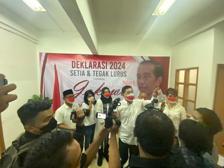 “Saya Silfester Matutina Ketua Umum Solidaritas Merah Putih (Solmet) berikrar, 2024 setia dan tegak lurus bersama Jokowi,” kata Silfester.