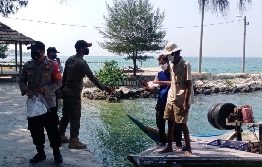 Faktual.Net, Kepulauan Seribu, DKI Jakarta-Polsek Kepulauan Seribu Selatan Polres Kepulauan Seribu melalui Personel Polsubsektor dan Bhabinkamtibmas Pulau Lancang bersama Satpol PP setempat membagikan masker kepada warga nelayan di Pulau Lancang Kelurahan Pulau Pari Kecamatan Kepulauan Seribu Selatan, Minggu (17/10/2021).