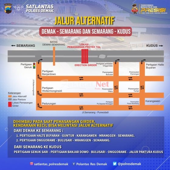 Sementara itu Sat Lantas Polres Demak melalui akun instagram resminya, @satlantas_polresdemak menginformasikan kepada para pengendara bahwa akan dilaksanakan penerapan buka-tutup jalan pada pemasangan girder tersebut.