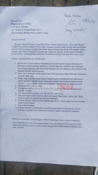 Sementara itu Bupati Kabupaten Toba Ir. Poltak Sitorus, setelah tayang berita terdahulu, melalui pesan WAnya menjelaskan bahwa terkait adanyan Surat Laporan yang tertandatangan Guru-guru SDN 175803 Tampahan, sudah Diperintahkan Kadisdikpora untuk mempelajarinya.