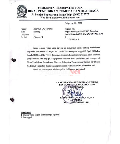 Kadisdikpora Sudah menyatakan hasil temuan adanya kelakuan yang kurang baik dari Kepala sekolah Rumondang Simanjuntak, dan melayangkan Surat Teguran hingga 2 kali yaitu, Teguran kesatu, 21 Maret 2023, dan Teguran Kedua, 25 Mei 2023, tetapi informasi yang didapat hingga kini belum ada Tindakan apapun terhadap Kepala sekolah SDN 175803 Tampahan Kabupaten Toba Sumut.