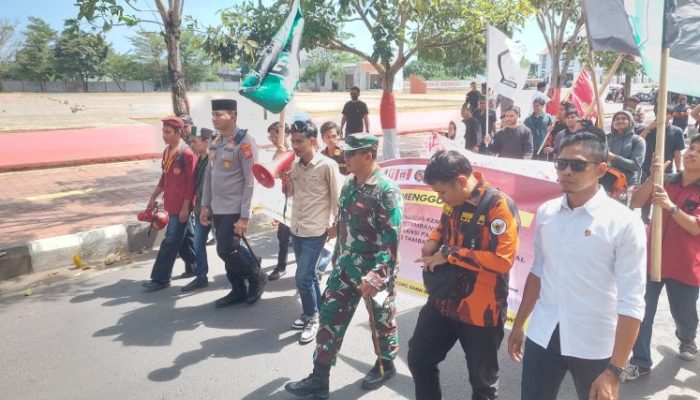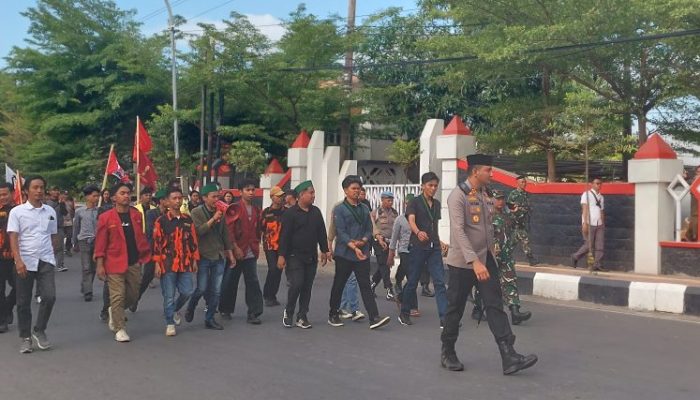 Kapolres Gowa bersama Dandim 1409/Gowa tampak berjalan kaki mendampingi para pengunjuk rasa, memastikan jalannya kegiatan berlangsung aman dan tertib.
