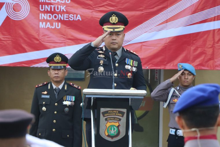 Faktual.Net, Kepulauan Seribu, DKI Jakarta – Kapolres Kepulauan Seribu, AKBP Jarot Sungkowo, S.H., S.I.K., beserta pejabat utama Polres Kepulauan Seribu, mengikuti dengan khidmat upacara virtual dalam rangka memperingati Hari Ulang Tahun Republik Indonesia yang ke-78. Upacara berlangsung di Aula Wicaksana Laghawa Polres Kepulauan Seribu pada Kamis (17/08/2023). Peringatan ini dijalankan melalui platform virtual atau live streaming, dengan Presiden Joko Widodo sebagai inspektur upacara yang memimpin dari Istana Negara, Jalan Merdeka Barat, Jakarta.