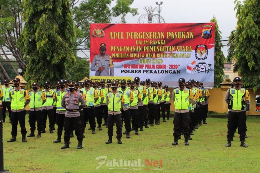 Faktual.Net, Pekalongan, Jateng –  Kepolisian Resor (Polres) Pekalongan gelar Apel Pergeseran Pasukan dalam rangka Pengamanan Tempat Pemungutan Suara (TPS) Pemilihan Bupati Dan Wakil Bupati Pekalongan Tahun 2020 di Lapangan Apel Mapolres Pekalongan dengan tetap menerapkan Protokol Kesehatan (Prokes) guna Pencegahan Penyebaran Covid-19, Senin (7/12/2020).