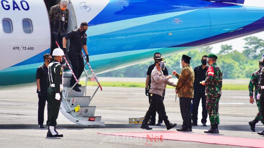 Presiden Jokowi beserta rombongan tiba di bandara tersebut dengan menggunakan pesawat khusus ATR 72-600 dari Pangkalan TNI AU Halim Perdanakusuma.