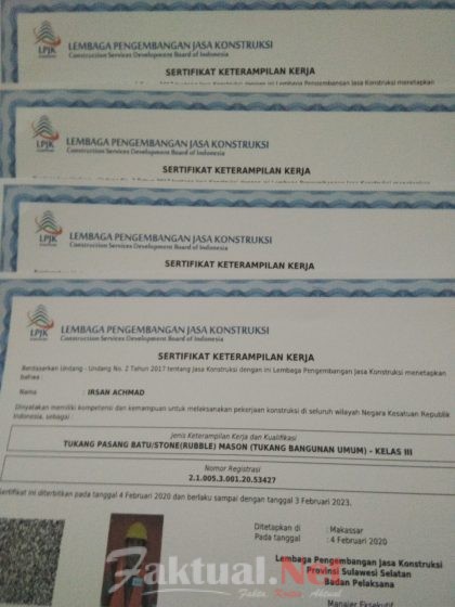 Lembaga pengembangan jasa konstruksi (LPJK) telah menerbitkan 356 sertifikat dan akan menyusul 137 sertifikat untuk angkatan terakhir, Terdiri 4 angkatan