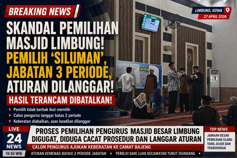 Faktual.net, Gowa – Polemik pemilihan pengurus Masjid Besar Limbung, Kecamatan Bajeng, Kabupaten Gowa, mencuat ke publik. Seorang calon pengurus, Drs. Syamsuddin, resmi mengajukan surat keberatan/banding administrasi kepada Camat Bajeng terkait proses dan hasil pemilihan yang dinilai bermasalah.