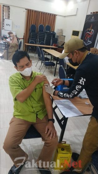 Faktual.Net, Gowa, Sulsel – Ketua, anggota, pejabat dan staf sekretariat Komisi Pemilihan Umum (KPU) Kabupaten Gowa Sulawesi Selatan( Sulsel)mengikuti Vaksinasi Covid-19 tahap pertama di Aula Kantor KPU Gowa, Senin 12 Juli 2021. Dalam Vaksin tersebut, Petugas langsung diterjunkan dari Dinas Kesehatan Kabupaten Gowa bersama PKM Somba Opu.