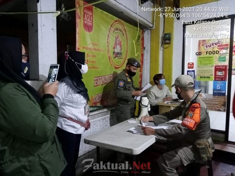 Faktual.Net, Jakarta Utara, DKI Jakarta-Satpol PP Kelurahan Kelapa Gading Timur, Kelapa Gading, Jakarta Utara menjatuhkan sanksi terhadap tiga tempat usaha yang dimonitoring dalam giat pengawasan PPKM Mikro, Minggu (27/06/2021) malam.