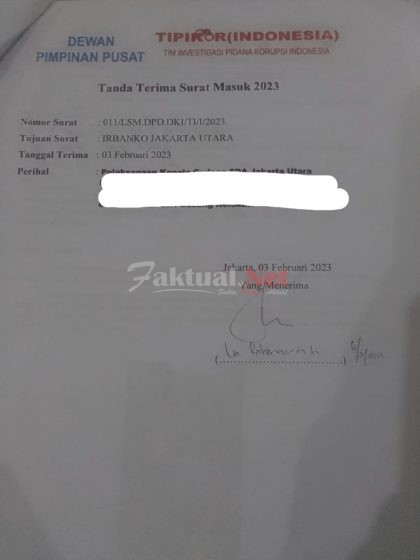 faktual.net, Jakarta – Lsm Tipikor Indonesia DPD DKI Jakarta menunggu Hasil Pemeriksaan Informasi Laporan terkait Limpahan Dokumen Hasil Pemeriksaan Kejakasaan Negeri (kejari) Jakarta Utara, yang menyatakan bahwa Hasil periksa Kejari Informasi Laporan Lsm Tipikor Indonesia adalah Murni Pencurian yang dilakukan oleh Karyawan Sudin SDA Jakut, pelimpahan yang dilakukan sekira pada Bulan Desember 2022.