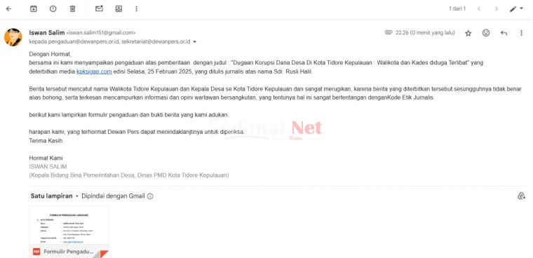 “Kami sudah mengisi formulir pengaduan, dan telah dilaporkan ke Dewan Pers melalui e-mail,” ungkap Iswan Salim, Kepala Bidang Bina Desa pada DPMD Kota Tidore, Jumat, (28/2/25).