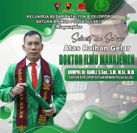 Pencapaian gemilang ini diraih oleh Komandan Batalyon B Pelopor Satbrimob Polda Sulawesi Selatan, Kompol DR. Ramli, S.Sos., S.M., , M.M. Kelulusannya merupakan bukti nyata kesungguhan dan dedikasi yang luar biasa bagi seorang Bhayakara sejati. Penganugerahan gelar tersebut diraih setelah melalui proses panjang penelitian dan ujian terbuka di hadapan para guru besar UMI.