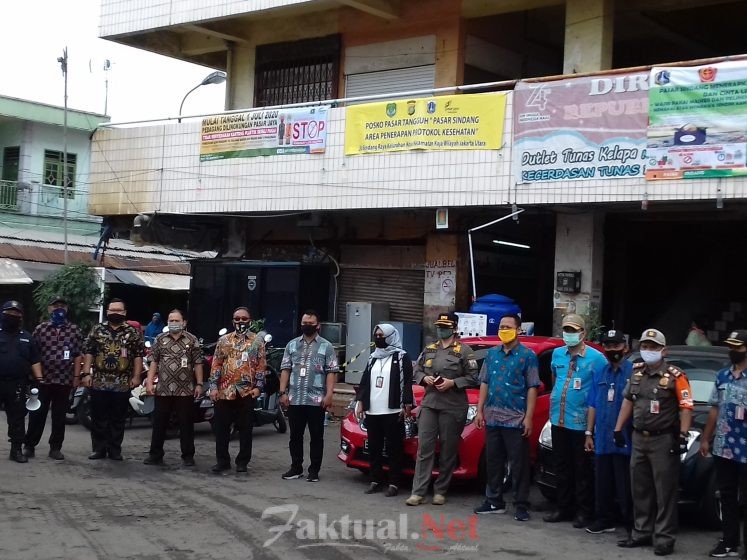Faktual.Net, Jakarta-Petugas gabungan melakukan pengawasan penerapan Pembatasan Sosial Berskala Besar (PSBB) sekaligus protokol kesehatan pencegahan Coronavirus Disease 2019 (COVID-19) di Pasar Sindang, Kelurahan Koja, Kecamatan Koja, Jakarta Utara, Kamis (16/07/2020).