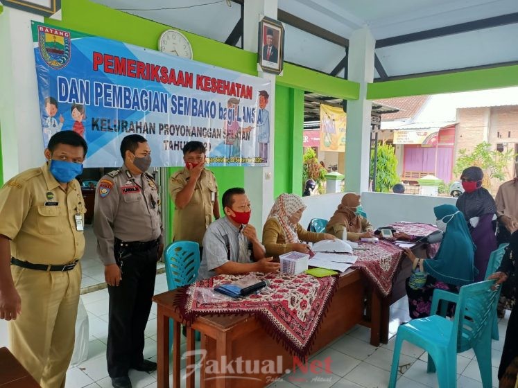 Faktual.Net, Batang, Jateng – Sebagai bentuk Kepedulian kesehatan kepada warga terutama pada lansia selama pandemi covid-19, aparatur Kelurahan Proyonanggan Selatan bekerja sama dengan bidan desa, melakukan pemeriksaan kesehatan dan pengobatan gratis yang berlangsung di pendopo kelurahan setempat, Selasa (22/9/2020).