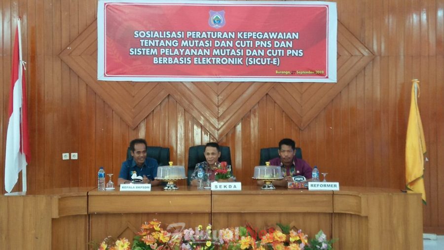 Faktual.Net, Butur, Sultra. Sosialisasi Peraturan Kepegawaian Tentang Mutasi dan Cuti PNS Berbasis Elektronik (SICUT-E) lingkup Kabupaten Buton Utara (Butur) di buka secara resmi oleh Sekretaris Daerah Kab. Buton Utara Drs. Muhammad Yasin, bertempat di Aula Bappeda Kab. Buton Utara pada Jum’at, 27/9/2019.