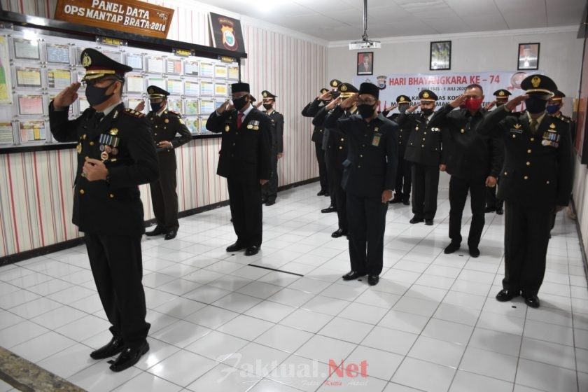 Kegiatan upacara HUT Bhayangkara secara virtual, pemusnahan barang bukti miras dan syukuran hari bhayangkara dilakukan dengan menerapkan dan mematuhi seluruh protokol kesehatan berupa menggunakan masker, menjaga jarak, mengenakan sarung tangan dan mencuci tangan di air mengalir pakai sabun.(hms)