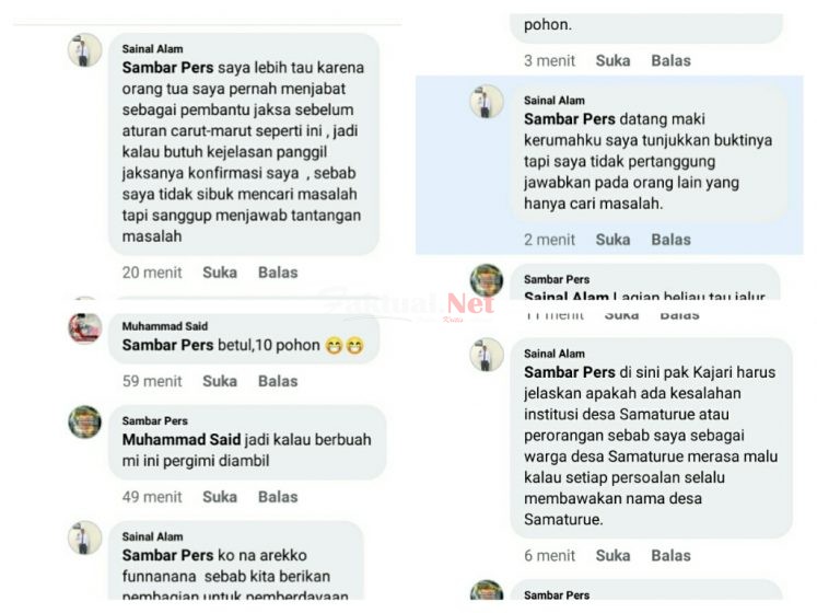 “Datang maki kerumahku saya tunjukkan buktinya tapi saya tidak pertanggung jawabkan pada orang lain yang hanya cari masalah, saya lebih tau karena orang tua saya pernah menjabat sebagai pembantu jaksa sebelum aturan carut-marut seperti ini, jadi kalau butuh kejelasan panggil jaksanya konfirmasi saya, sebab saya tidak sibuk mencari masalah tapi sanggup menjawab tantangan masalah” tulisan tanggapan di akun Facebook milik Sainal Alam.