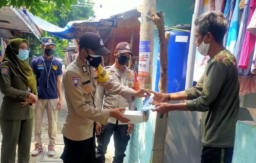 Masker dibagikan secara Door to Door kepada warga yang berada di ruang publik dan lingkungan pemukiman warga untuk menghindari terjadinya kerumunan.
