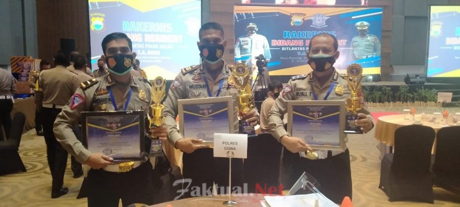 Faktual.Net, Gowa, Sulsel – Sat Lantas Polres Gowa torehkan prestasi dalam ajang lomba HUT Lalu Lintas Bhayangkara Ke 65 yang di gelar oleh Polda Sulsel.Tak tanggung tanggung, mereka memboyong tiga penghargaan sekaligus, Rabu 02 Desember 2020 di Hotel Four Point By Seraton Makassar.
