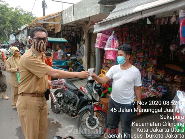 Jakarta, Faktual.Net– Sebanyak 400 masker dibagi oleh Puskesmas Kelurahan Sukapura bekerjasama dengan Kelurahan Sukapura untuk pedagang Pasar Proyek, Selasa (17/11).