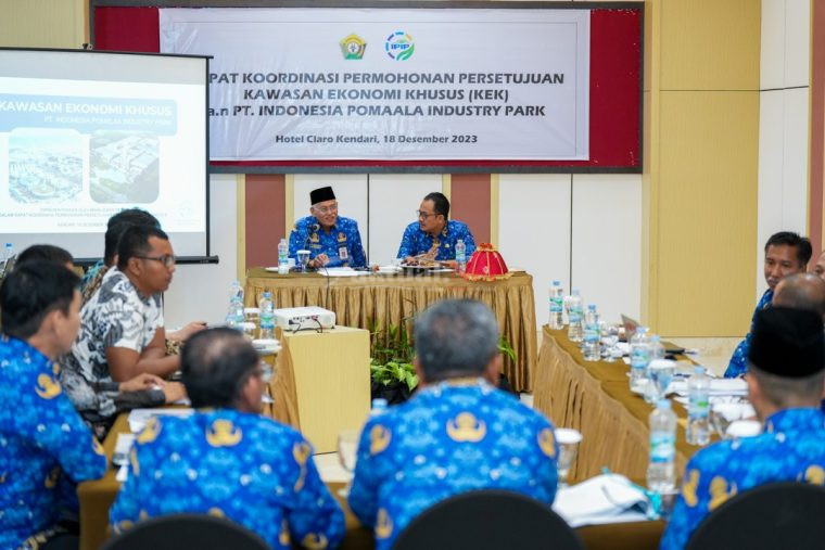 Faktual.Net, Kendari — Sekretaris Daerah (Sekda) Provinsi Sulawesi Tenggara (Sultra), Drs. H. Asrun Lio, M.Hum.,Ph.D, Pimpin Rapat Koordinasi (Rakor) permohonan persetujuan Kawasan Ekonomi Khusus (KEK) PT Indonesia Pomaala Industri Park (IPIP) di ruang Azalea Hotel Claro Kendari