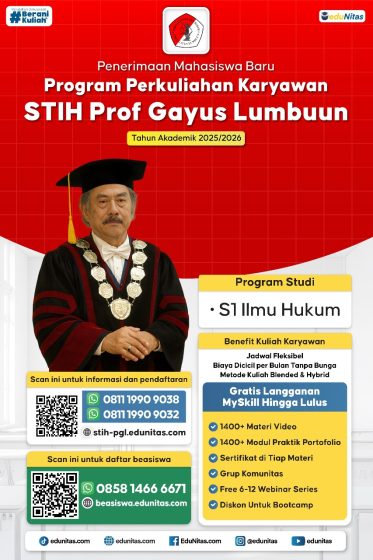 Faktual.net – Jakarta Pusat, DKI Jakarta, Selasa (27/1/2026) – Program S1 Ilmu Hukum Hadirkan Fasilitas Blended Learning dan Benefit Eksklusif dari EduNitas – Sekolah Tinggi Ilmu Hukum (STIH) Prof Gayus Lumbuun kembali membuka pendaftaran Mahasiswa Baru untuk Program Perkuliahan Karyawan Tahun Akademik 2025/2026. Program S1 Ilmu Hukum yang bekerja sama dengan EduNitas dirancang khusus untuk memenuhi kebutuhan profesional yang ingin melanjutkan pendidikan tinggi tanpa mengganggu aktivitas kerja sehari-hari.