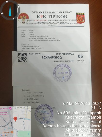 Yayasan KPK Tipikor Pusat bersama Dewan Pimpinan Daerah (DPD) GAKORPAN Provinsi Riau resmi menyerahkan berkas laporan ke Sekretariat Istana Negara Republik Indonesia melalui Kementerian Sekretaris Negara, Jumat (06/03/2026).