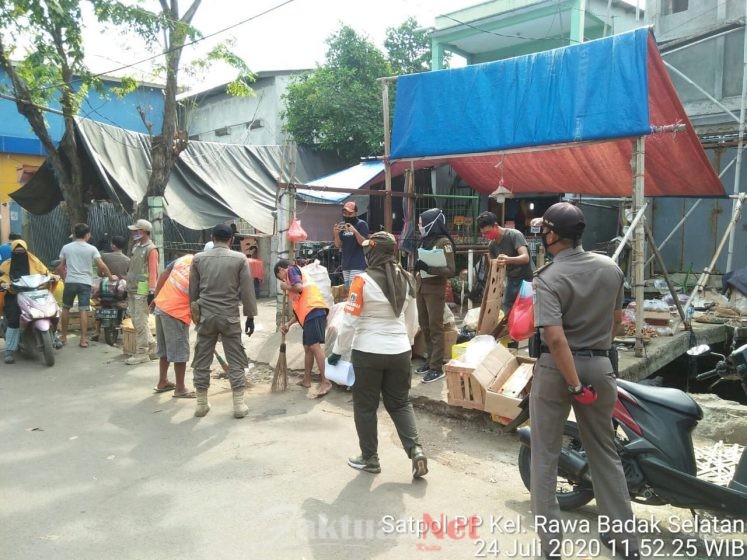 Di Kelurahan Rawa Badak Selatan tercatat 14 warga terjaring dalam operasi yang dilaksanakan di Jl Bendungan Melayu, Jumat (24/07/2020). Oleh petugas mereka dijatuhi sanksi kerja sosial maupun denda administrasi.