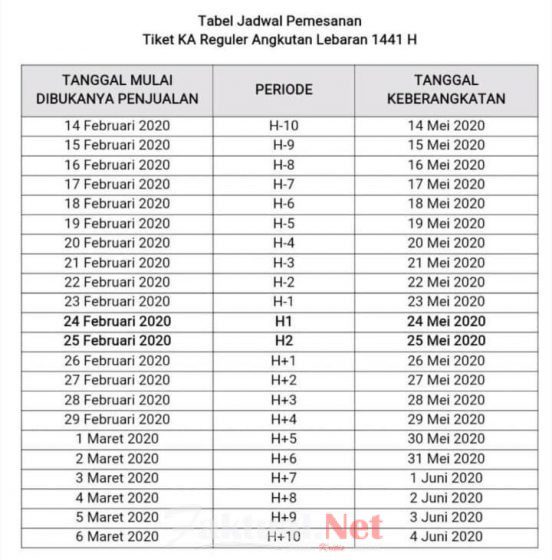 “Tiket KA Reguler masa Angkutan Lebaran 1441 H akan dijual mulai 14 Februari 2020 pukul 00.00 WIB untuk keberangkatan H-10 Lebaran atau 14 Mei 2020 dan seterusnya,” ucap Direktur Utama KAI, Edi Sukmoro. Selasa, (11/2/2020).