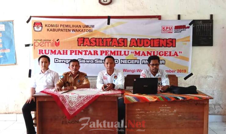 Faktual.Net, Wakatobi, Sultra. Dalam meningkatkan wawasan kepemiluan masyarakat, Komisi Pemilihan Umum (KPU) Kabupaten Wakatobi melakukan audensi Rumah Pintar Pemilu (RPP) “Manugela” kepada siswa Sekolah Dasar (SD), Sekolah Menengah Pertama (SMP) di SDN Antapia dan SMPN 5 Wangi-Wangi, pada Senin, 9/12/2019.