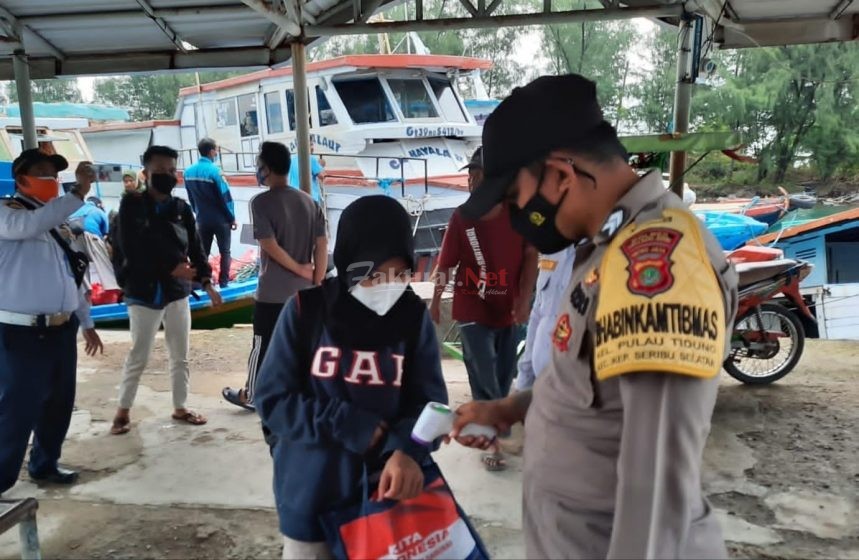 Faktual.Net, Kepulauan Seribu, DKI Jakarta- Dalam rangka mengantisipasi masuknya Covid-19 ke Pulau Seribu, Personel Gabungan Polsek Kepulauan Seribu Selatan terus melakukan kegiatan pengawasan ProKes (Protokol Kesehatan), Cek suhu badan dan pemeriksaan sertifikat vaksin kepada warga yang baru tiba di Dermaga Kedatangan Pulau Tidung. Selasa (14/09/2021).