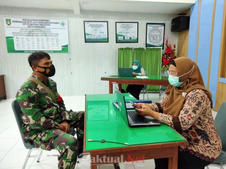 Faktual.Net, Surakarta – Babinsa Kelurahan Kratonan Koramil 03 Serengan Kodim 0735 Surakarta Serma Yudhi W adakan Komunikasi Sosial (Komsos) untuk berkoordinasi dengan Dokter Pukesmas Kratonan di Jalan Pringgodani No. 34 Kratonan Kelurahan Kratonan Kecamatan Serengan Perawat Ida Prihatin selaku perawat Puskesmas Kratonan, (10/02/2021)