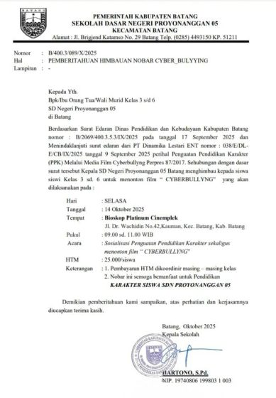 Kepala SD Negeri Proyonanggan 05, Hartono, menjelaskan bahwa kegiatan tersebut bermula dari undangan resmi melalui Dinas Pendidikan dan Kebudayaan (Disdikbud) Kabupaten Batang. Dalam surat itu, para kepala sekolah SD dan SMP diundang menghadiri acara pemutaran film “Cyberbullying” yang juga dihadiri perwakilan Bupati, Kapolres, serta sejumlah pejabat daerah.